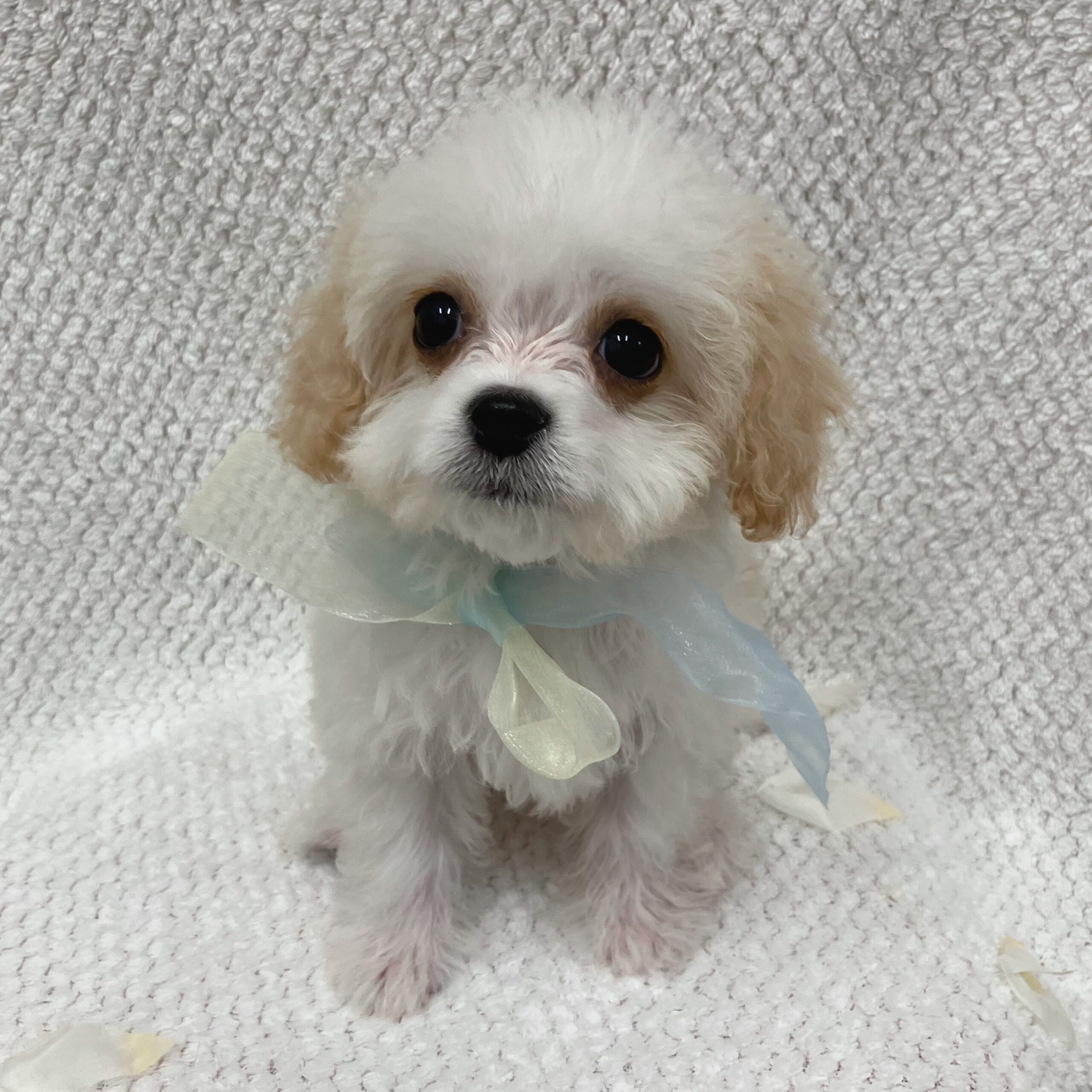 MIX(キャバリア×ビションフリーゼ) 2026 3/07 好奇心旺盛でとってもパワフルな男の子🎶 毛色 ホワイト&クリーム 性別 男の子 生年月日 2025年11月29日生まれ 販売店 サンペット弘前安原店の子 シーズー マルチーズ